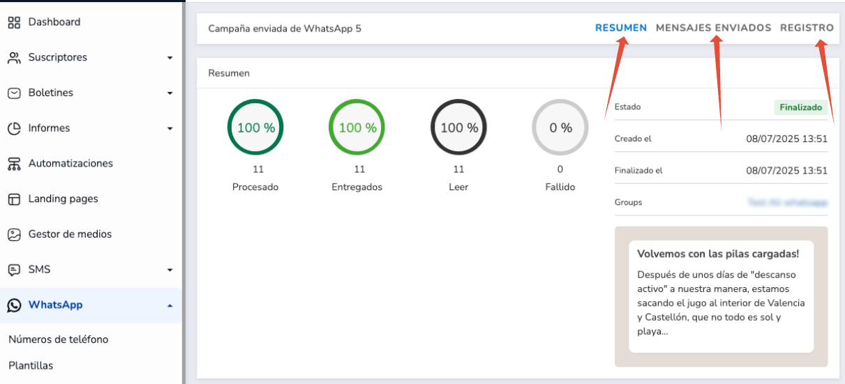 En esta zona hay tres pestañas y por defecto accederás a la de resumen (Resumen), donde podrás ver la cantidad de teléfonos a los que enviaste (Procesado), el porcentaje de entregados (Entregados), las lecturas obtenidas (Leer) y si hubiera alguno que no se hubiera podido entregar (Fallido).