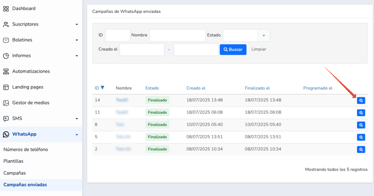 Cuando envías campañas es necesario comprobar el resultado de las mismas, esto lo puedes hacer fácilmente desde la opción Campañas enviadas de WhatsApp.